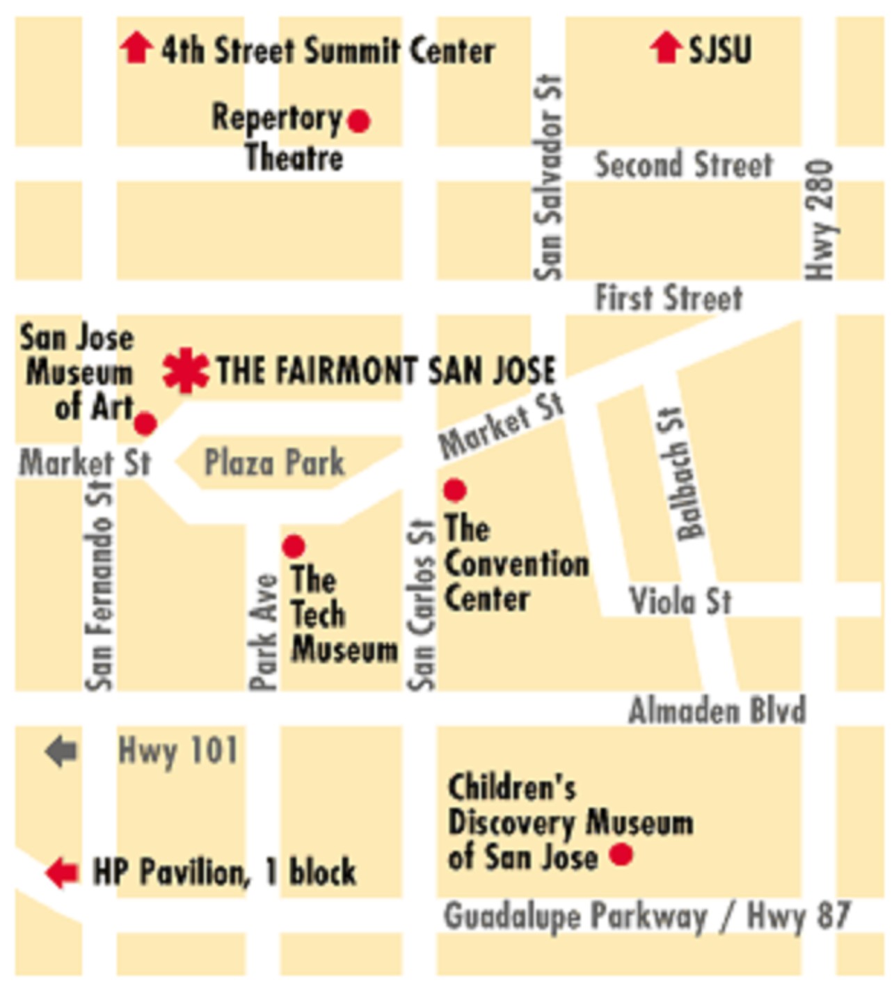 - The Hotel is located between San Fernando St. and San Carlos St. Once you cross San Fernando St., you will need to circle Plaza de Cesar Chavez Park.