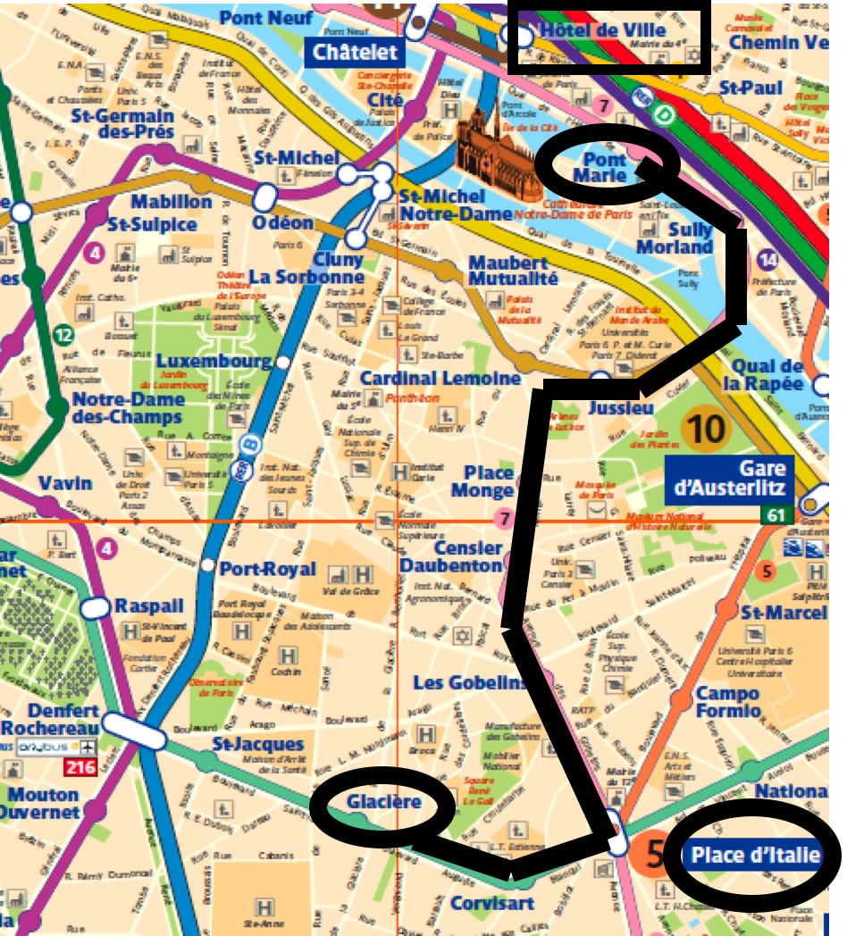 - 6 Stations later, stop at Station Pont Marie